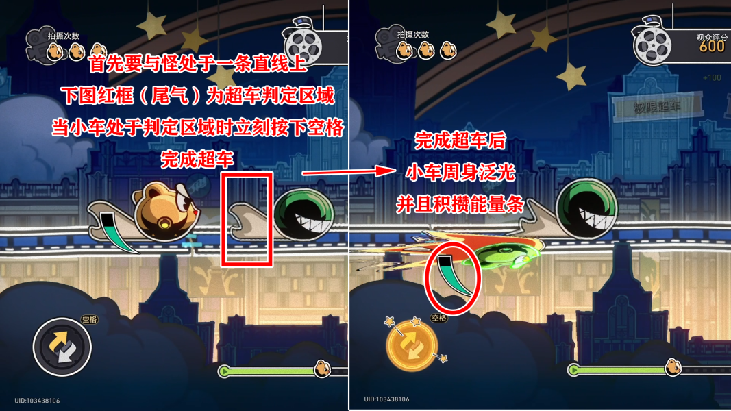 判定成功:判定成功小车会有明显的加速,且周身泛光(无敌),并积攒能量条