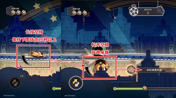 2、在游戏中长按空格(小车就会进入轨道“中间”)保持10秒,然后松开空格即可获得成就(记得一定要松开,不松开是不能获得的)。