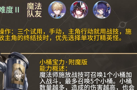 1、魔法师效果:召唤至多5个小桶加入战斗。战斗中每存在1个小桶,我方全体造成的伤害提高60%,小桶数量达到5个时额外提高100%。