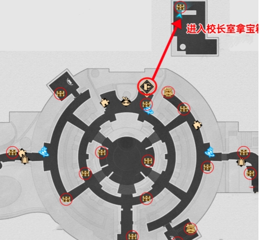 2、特殊宝箱:其中一个宝箱在校长室中,玩家可从格拉克斯雕像附近的锚点旁,通过蓝线进入。