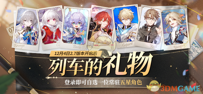 2.7版本开启后,到3.2版本结束前,开拓者登录游戏即可领取「列车的礼物」,自选常驻五星角色一名。