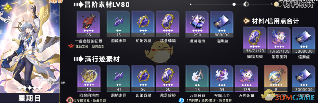 以下材料为星期日升级至80级,升满所有行迹所需的材料介绍,想要培养星期日的玩家可以囤起来了。