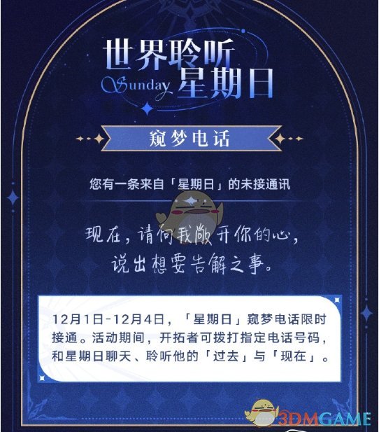 窥梦电话:在活动期间星期日窥梦电话限时接通,开拓者拨打指定电话号码即可和星期日聊天;