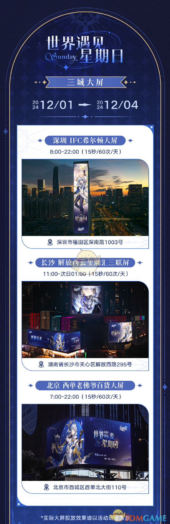 世界遇见星期日是三城大屏打卡活动,在深圳、长沙、北京三个城市的黄金地段可以打卡星期日的大屏海报;