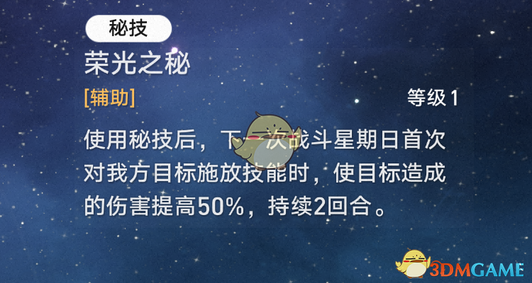 随身秘技,效果不进战斗不消失;可以理解为给星期日的暖机补偿,由于司铎套和星期日专武效果都是需要叠层的,秘技可以在叠层满之前补偿主C伤害。