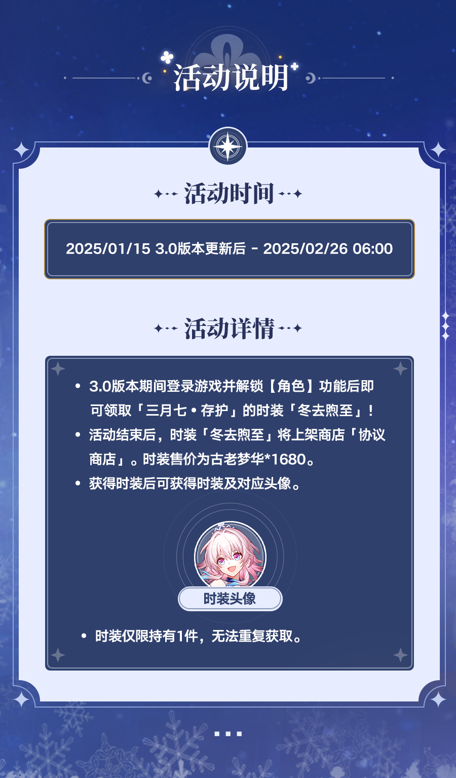 玩家可以在3.0版本期间登陆直接领取 冬去煦至时装。