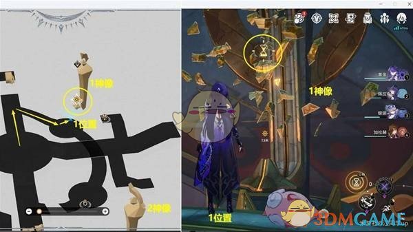 然后,将手掌放置到5号位置的塔桥上,退出后,再前往2号位置稍微左侧,面向2号神像,长按空格键进行回溯,即可完成第二个神像的解密。