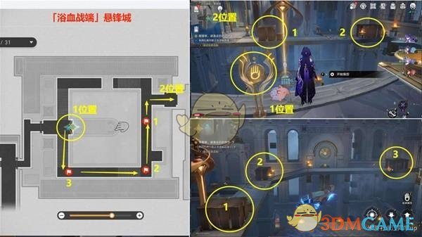 任务进行到【悬锋啊,请涤去你的血锈·下--点燃火盆,完成试炼】时,首先追踪任务指示前往2号位置完成解密,完成后,1号位置的火盆将会被点燃。