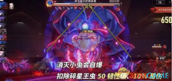 3、打法介绍:注意使用解控角色来清除碎星王虫的单体攻击辐裂蛰毒,期间还需要频繁消灭召唤物。