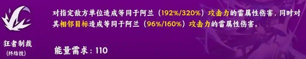 3、终结技 - 狂者制裁:对敌方单体造成高额雷属性伤害,同时对其相邻目标造成一定比例的雷属性伤害,具有扩散打击效果,伤害可受天赋增伤影响。先释放战技提高增伤后再放终结技,伤害更高,但需注意能量控制,避免溢出 。