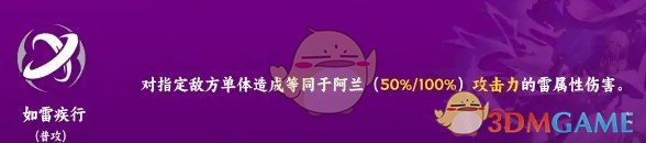 1、普攻 - 如雷疾行:对指定敌方单体造成雷属性伤害,伤害倍率随技能等级提升。一般在特定光锥需要普攻叠层时使用,常规战斗较少用到。