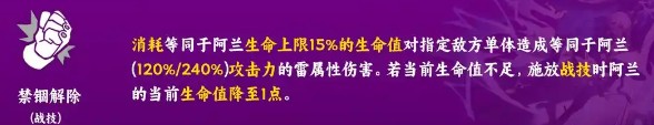 2、战技 - 禁锢解除:核心输出技能,消耗自身生命上限15%的生命值,对指定敌方单体造成高额雷属性伤害 。若当前生命值不足,施放后会降至1点存活 。不消耗战技点,能为队伍节省战技资源。判定顺序为先掉血增伤,再攻击出伤,配合天赋可打出高输出。