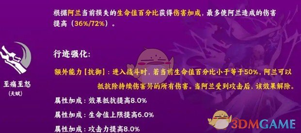 4、天赋 - 至痛至怒:根据阿兰当前损失的生命值百分比获得伤害加成,损失生命值越多,增伤越高。加成基于实时血量计算,例如天赋满级至多72%增伤,若血量损失50%,则增伤36% 。
