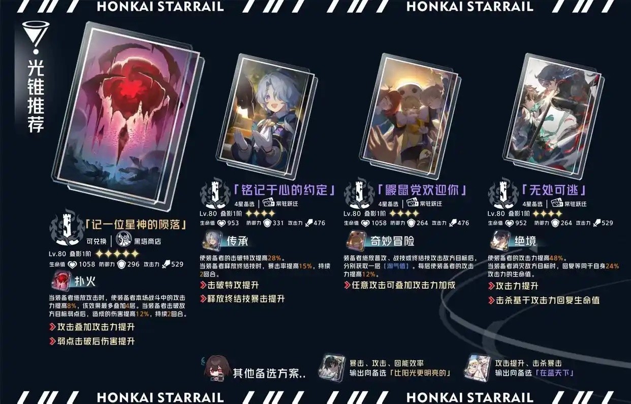 1、 记一位星神的陨落:黑塔商店可兑换,满叠影容易。高攻击白值,叠加64%攻击力加成,击破时增伤,契合雪衣,首选。