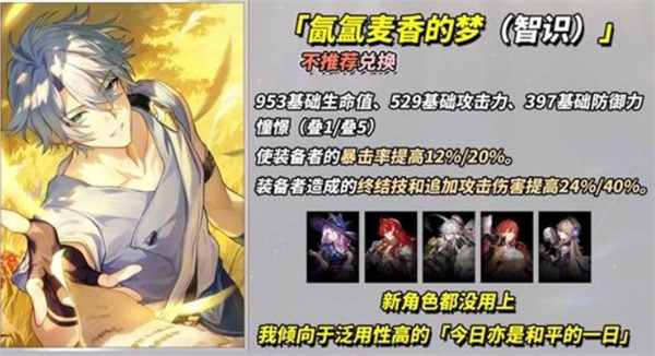 虽然看起来全队增伤很美好,但在实际作战中收益有限。若队伍核心并不依赖额外直伤,兑换优先级较低。