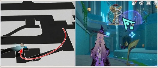 1、来到【酣歌海垠】-1层的空间,拾取下层的祷言,并回溯上面的巨大水杯,使水位下降