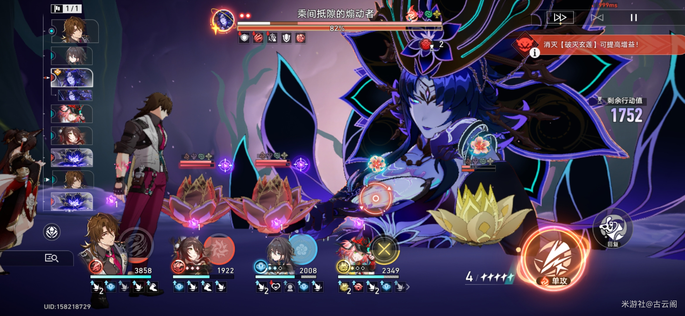 - 后续推进:击破首个小怪后,火力转向主怪,乱破群攻顺带清理剩余目标;期间若血量低于70%,优先击杀刷新的黑莲,能量不足则击杀金莲,保持“破韧→击退→集火”的良性循环,第一幕可在4回合内结束战斗。