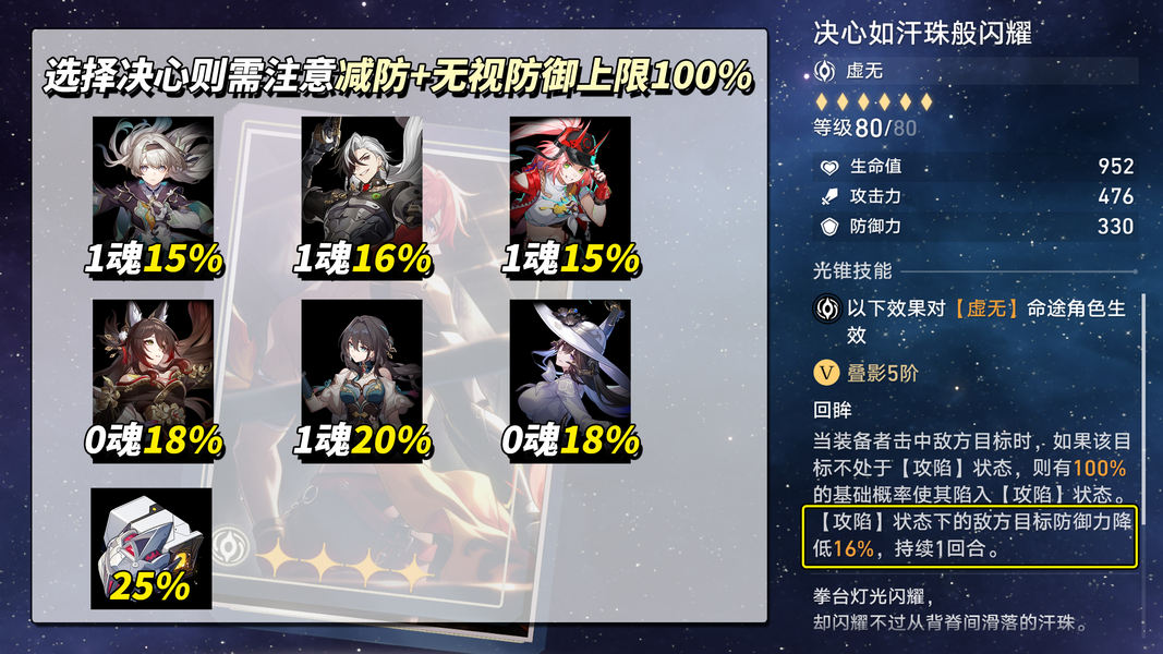 若你决定使用4星光锥「决心如汗珠般闪耀」,则需注意当前队伍减防、无视防御情况。