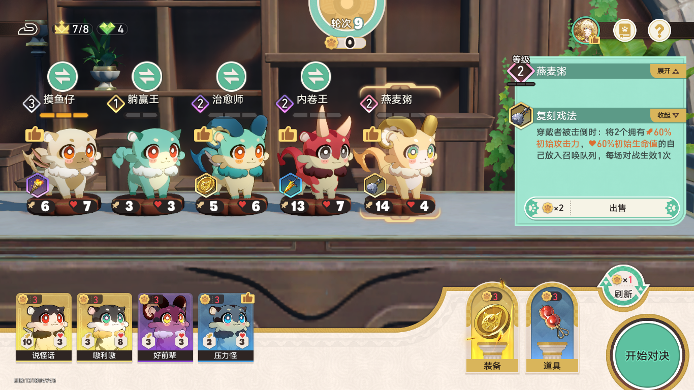 阵容一只要拿到核心装备:复刻戏法,通过【燕麦粥】每次立场给全体增加攻击来提升整容的强度,最终内卷王配合治愈师一穿多