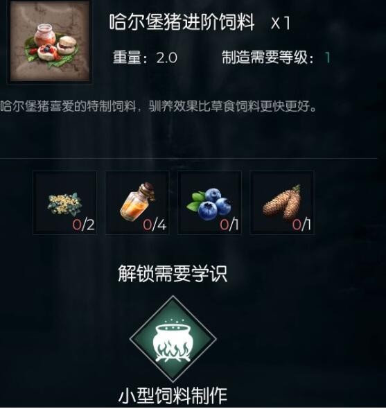 哈尔堡猪:草饲料:90 野蜂蜜:180 蓝莓:45 杉果:45 (采集技能:对草,花等植物释放可以获得块根和蘑菇)