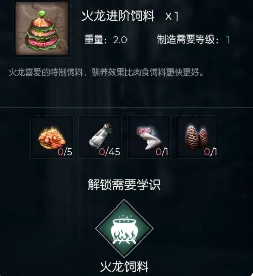 火龙:高级肉饲料:225 盐:2025 狮鹫翅膀:45 松塔:45(现阶段顶级宠物,听说强度不是很强,可能还没做好)