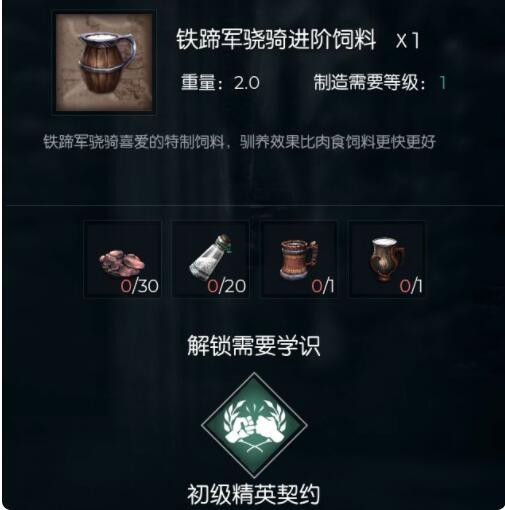 铁蹄军骁骑:肉饲料:1350 盐:900 烈酒:45 马奶:45(挺肉的一个远程输出宠物!)