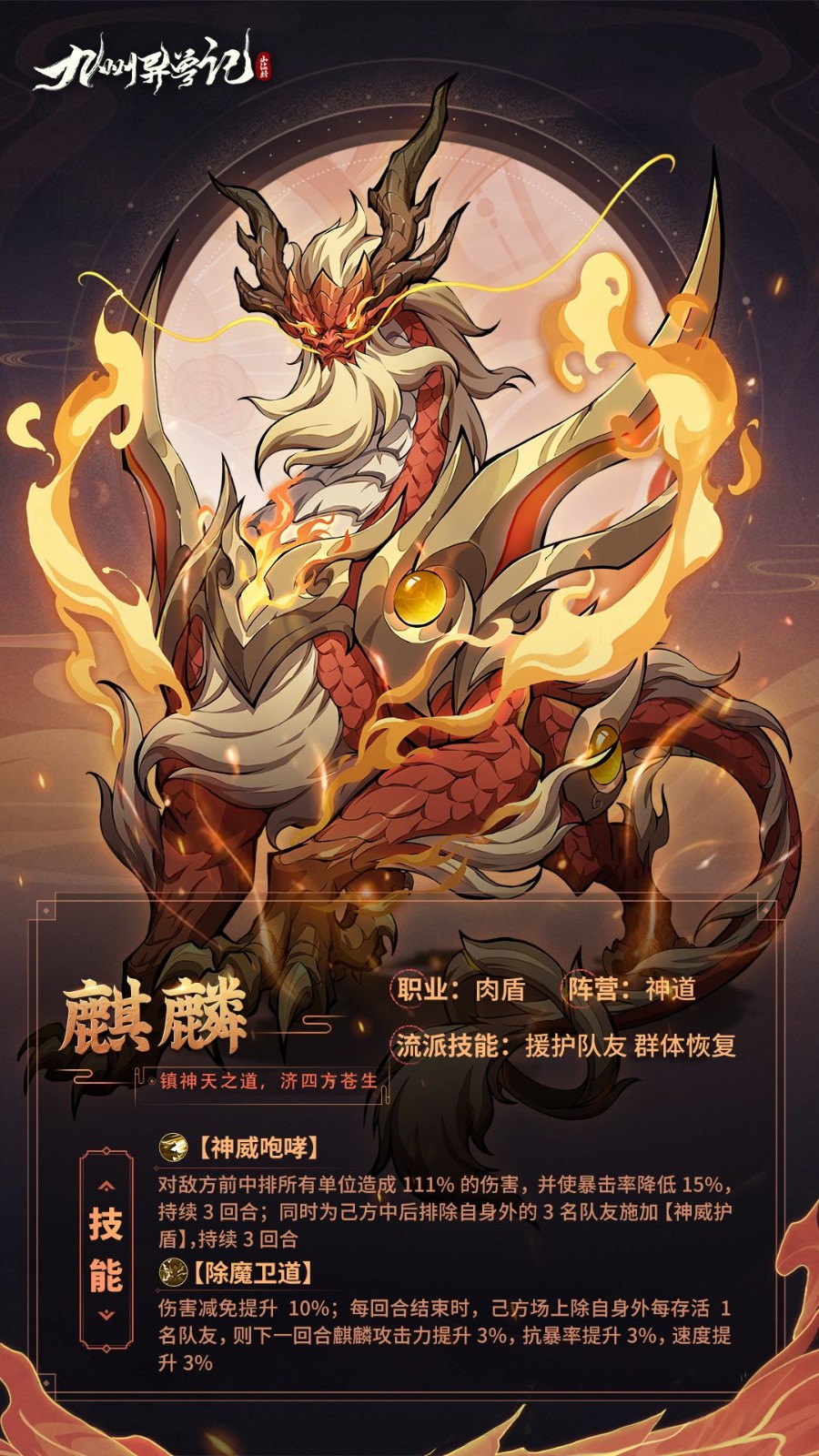 伤害减免提升10%;每回合结束时,己方场上除自身外每存活1名队友,则下一回合麒麟攻击力提升3%,抗暴率提升3%,速度提升3%