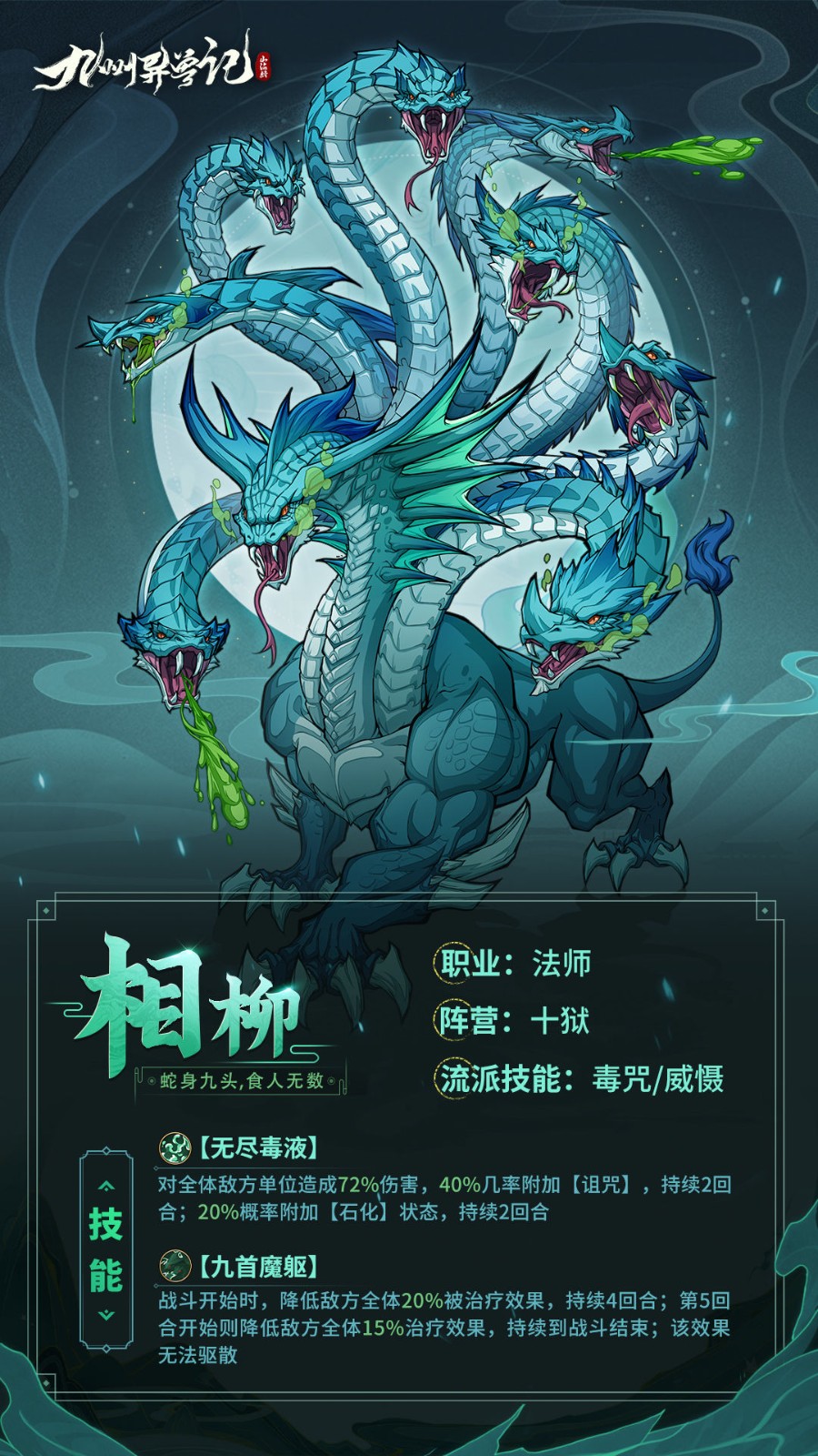 相柳,又称相繇,为共工之臣,中国神话传说中上古时代的凶神,相传相柳所到之处水源皆化为沼泽,禽兽飞禽不能活。,游戏中相柳怎么样呢?下面是小编给大家带来的《九州异兽记》相柳技能图鉴介绍,感兴趣的小伙伴们一起来看看吧。