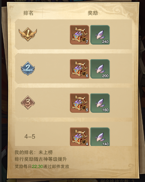 结算时间:每轮挑战完毕即可获得礼物,当日22:30后,开始结算排行榜奖励,并通过邮件发放奖励榜单奖励(1~999)