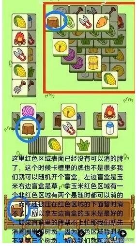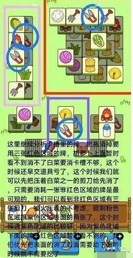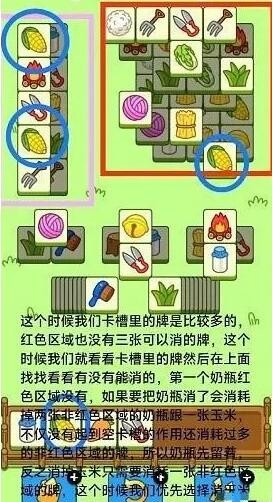 5、槽里牌少我们就挖红色区域能消的牌,卡槽里牌多,我们就利用非红色区域的牌清一下卡槽然后继续去挖红色区域的牌