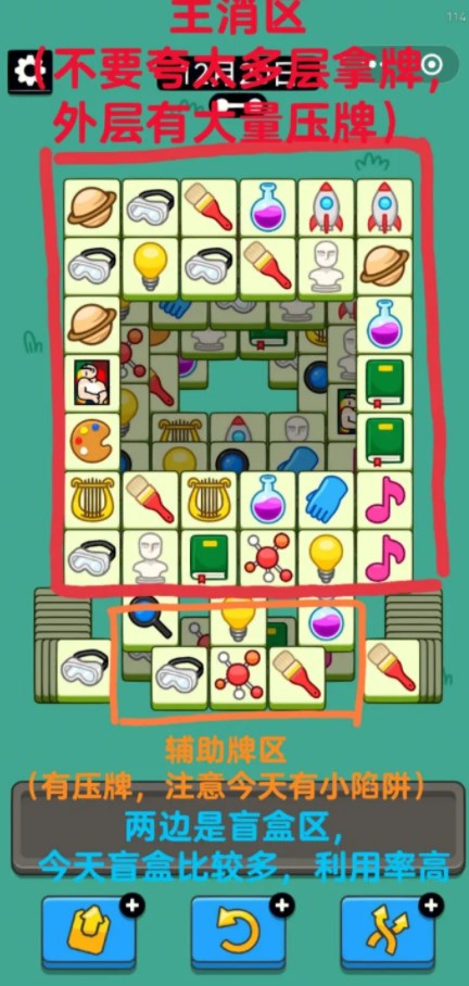 pk场:今天PK场也是要注意,要从外层向内层去消,因为外层会有大量的压牌,最好不要跨多层去拿牌,保证留牌位置。今天盲盒区的利用率要高于辅助牌区,可大胆拿牌。