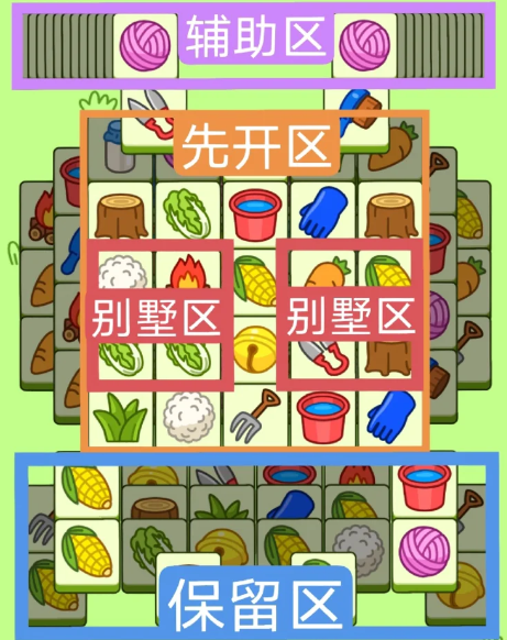 3.必要时可以用紫色盲盒区辅助消除,盲盒区后期不用留太多,留几张备用即可。