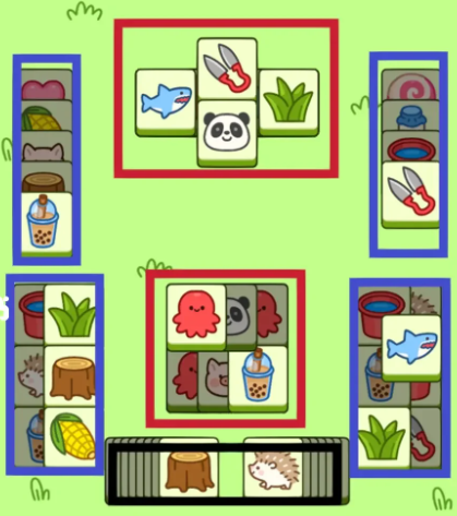 2.前期努力挖中央红色区域,后面的困难层如每图右侧,配合隐藏牌消除