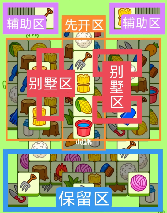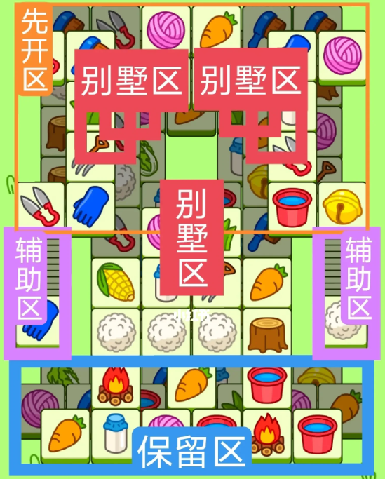 一个十字型大别墅,一个工字型大别墅,开局先消除橙色区。然后按照一层层均与消除表面牌,哪里压牌比较多就先消除哪里,必要时可以用盲盒区辅助消除表面牌,尽量还是以别墅区内互相消除为主,蓝色区有叠牌,但是不多,全部保留到后期使用。