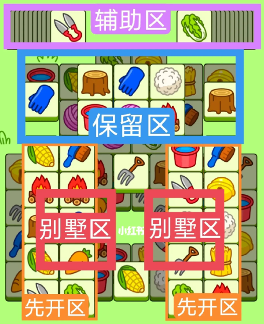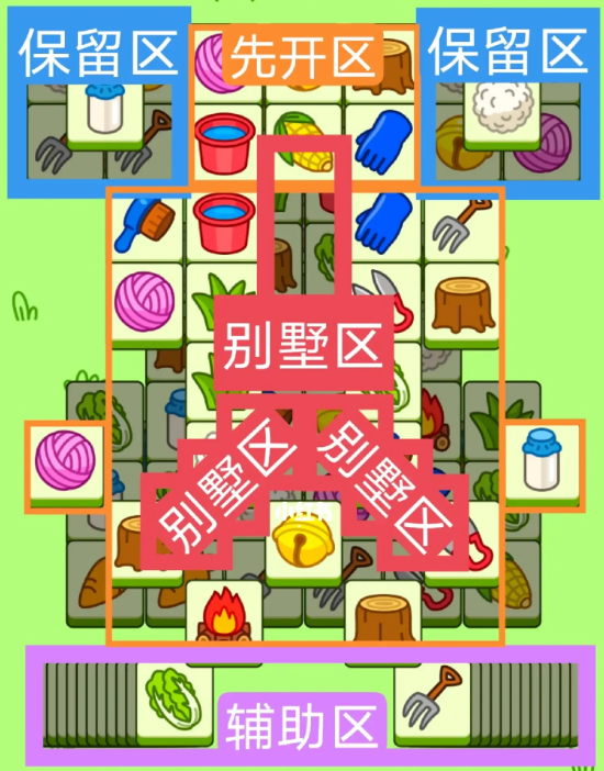 一个倒着的T字型大别墅,两个斜着的长形大别墅,开局先消除橙色区,然后按照一层层均匀消除表面牌,哪里压牌比较多就先消除哪里,必要时可以用盲盒区辅助消除表面牌,尽量还是以别墅区内互相消除为主,蓝色区有叠牌,但是不多,全部保留到后期使用。