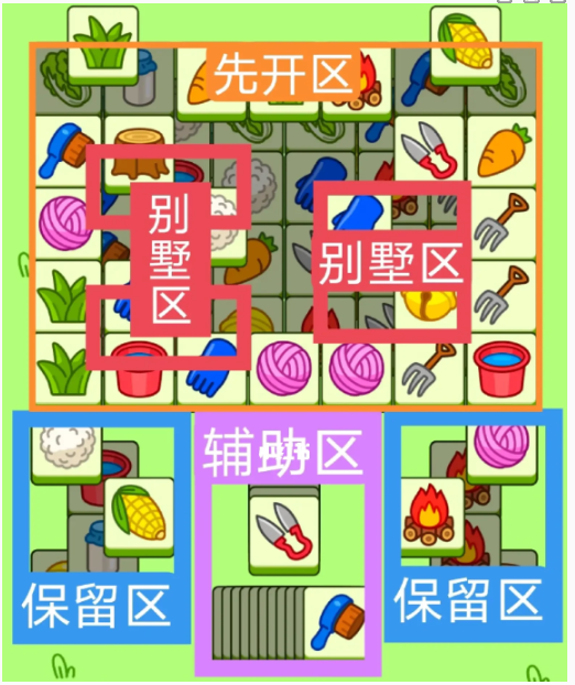 一个工字型大别墅,一个方形大别墅,开局先消除橙色区,然后按照一层层均匀消除表面牌,哪里压牌比较多就先消除哪里,必要时可以用盲盒区辅助消除表面牌,尽量还是以别墅区内互相消除为主,蓝色区有叠牌,但是不多全部保留到后期使用。