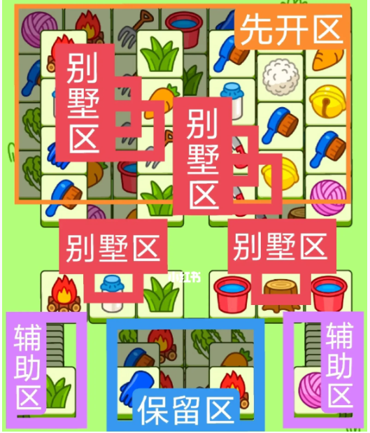 3.必要时可以用紫色盲盒区辅助消除,盲盒区后期不用留太多,留几张备用即可。