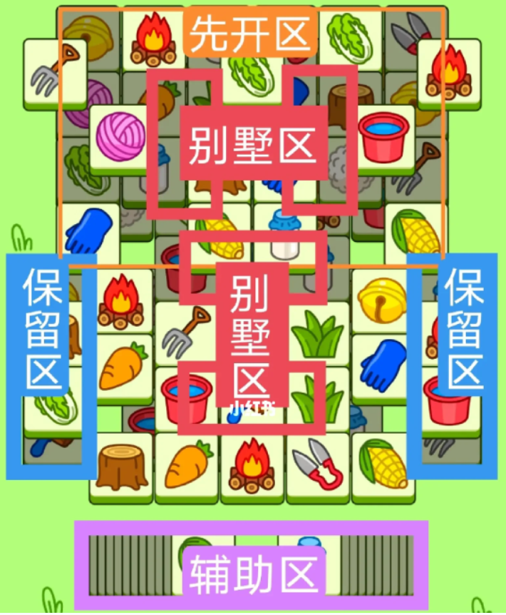 一个横着的长形别墅,三个竖着的长形别墅,开局先消除橙色区,然后按照一层层均匀消除表面牌,哪里压牌比较多就先消除哪里,必要时可以用盲盒区辅助消除表面牌,尽量还是以别墅区内互相消除为主,蓝色区有叠牌,但是不多,全部保留到后期使用。