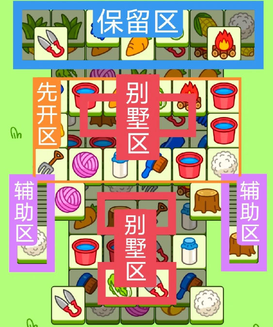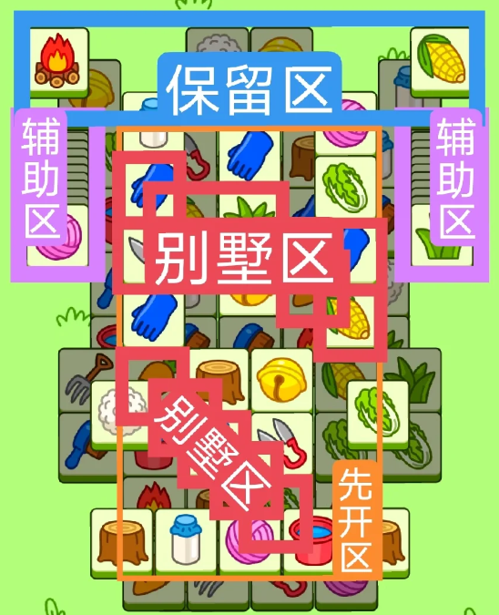 红色区域为今天的别墅区,开局先消除橙色区,然后按照一层层均匀消除表面牌, 哪里压牌比较多就先消除哪里,必要时可以用盲盒区辅助消除表面牌。尽量还是以别墅区内互相消除为主。蓝色区有叠牌,但是不多,全部保留到后期使用。