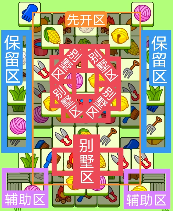 两个工字型大别墅组成,开局先消除橙色区,然后按照一层层均匀消除表面牌, 哪里压牌比较多就先消除哪里,必要时可以用盲盒区辅助消除表面牌。尽量还是以别墅区内互相消除为主。蓝色区有叠牌,但是不多,全部保留到后期使用。