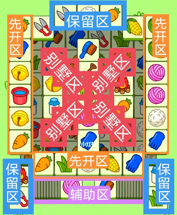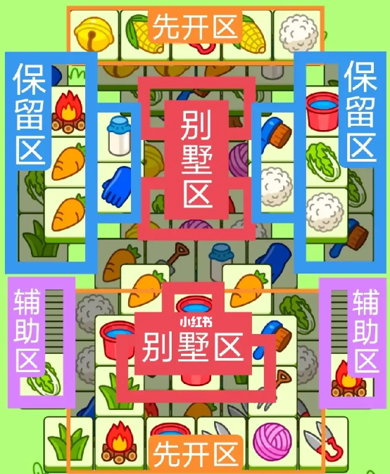 一个工字型大别墅,一个三角形大别墅,开局先消除橙色区。然后按照一层层均匀消除表面牌。哪里压牌此较多就先消除哪里,必要时可以用盲盒区辅助消除表面牌。尽量还是以别墅区内互相消除为主,蓝色区基本都是明牌,全部保留到后期使用。