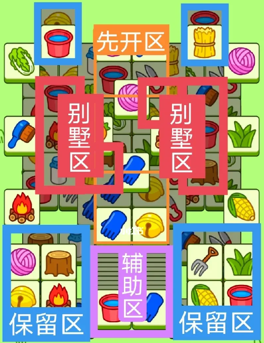 一个2+2+2叠牌大别墅,两个长形大别墅。开局先消除橙色区,然后按照一层层均匀消除表面牌,哪里压牌比较多就先消除哪里,必要时可以用盲盒区辅助消除表面牌,尽量还是以别墅区内互相消除为主,蓝色区有叠牌,但是不多,全部保留到后期使用。
