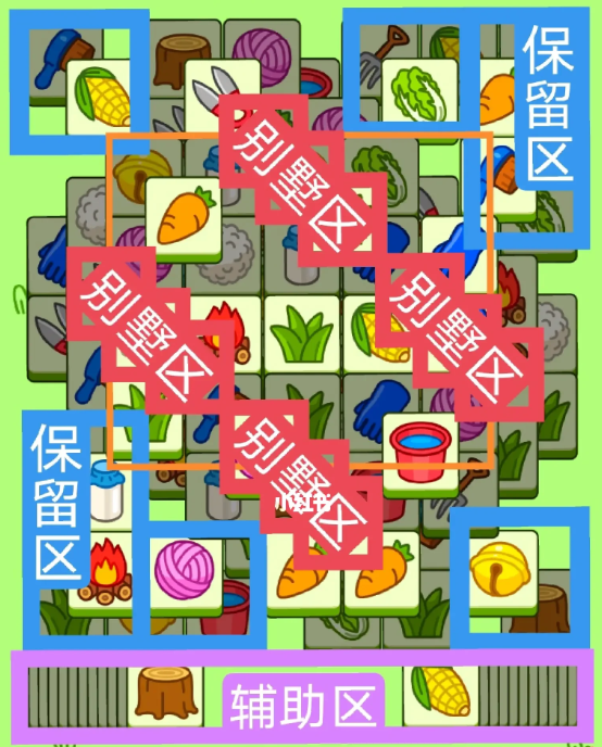 两个L字型大别墅,开局先消除橙色区,然后按照一层层均匀消除表面牌,哪里压牌比较多就先消除哪里,必要时可以用盲盒区辅助消除表面牌,尽量还是以别墅区内互相消除为主,蓝色区有叠牌,但是不多,全部保留到后期使用