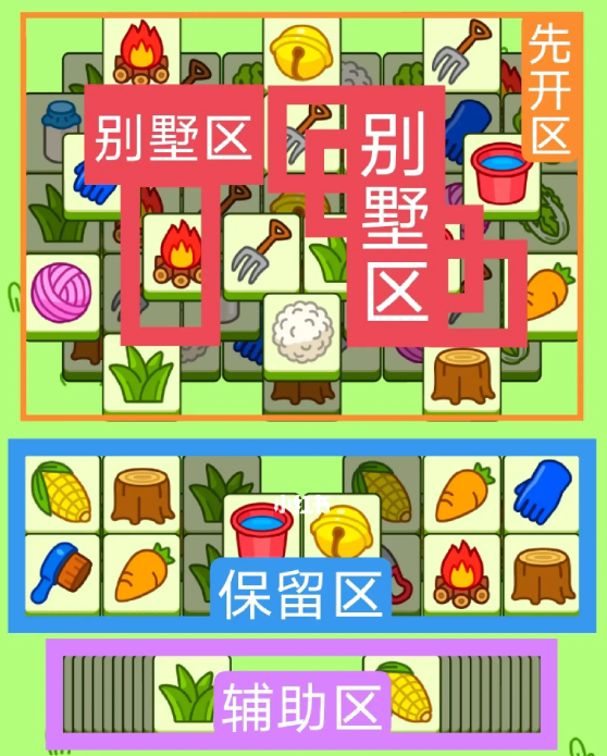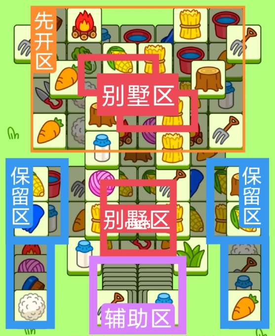 四个斜着的长形别墅组成,开局先消除橙色区,这里压牌此较多,然后按照一层层均匀消除表面牌,不要跨层太多拿牌。必要时可以用盲盒区辅助消除表面牌,尽量还是以别墅区内互相消除为王,蓝色区基本都是明牌,全部保留到后期使用。
