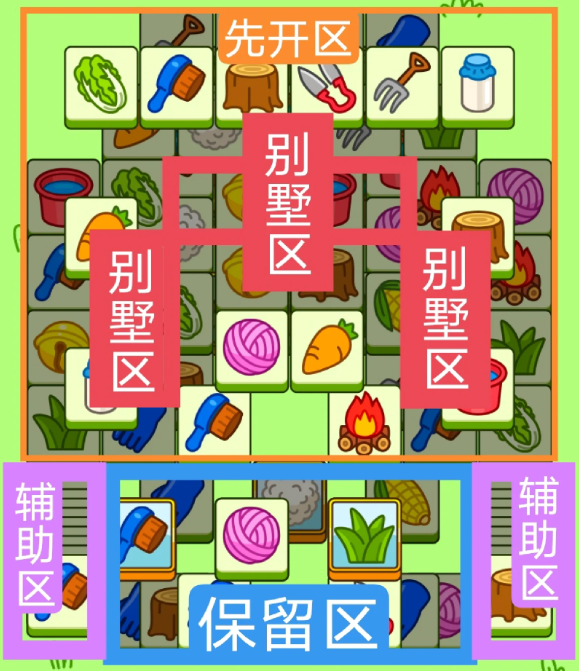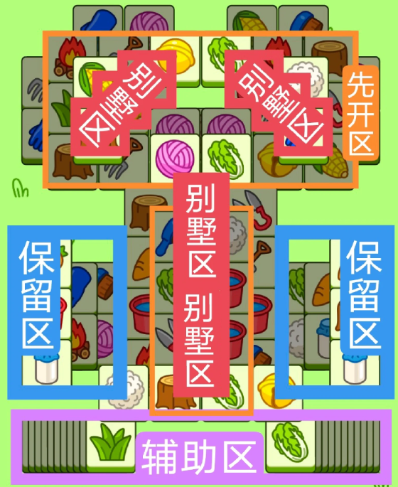 一个十字形大别墅,两个长型大别墅,开局先消除橙色区,然后按照一层层均匀消除表面牌, 哪里压牌比较多就先消除哪里,必要时可以用盲盒区辅助消除表面牌。尽量还是以别墅区内互相消除为主。蓝色区有叠牌,但是不多,全部保留到后期使用。