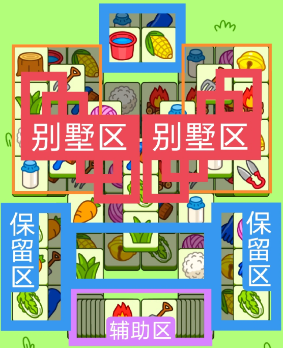 两个N字型大别墅,开局先消除橙色区,然后按照一层层均匀消除表面牌, 哪里压牌比较多就先消除哪里,必要时可以用盲盒区辅助消除表面牌。尽量还是以别墅区内互相消除为主。蓝色区有叠牌,但是不多,全部保留到后期使用。