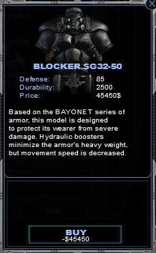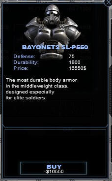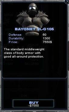 *基于Bayonet系列的护甲,这个版本被设计于为穿戴者提供抵御险峻伤害的能力,尽管液压技术大幅减少了护甲的重量,但是穿戴这套护甲时移动能力还是会减少。