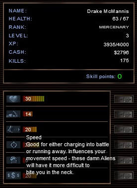 *并非越快越好,过快的移动速度会难以操控人物,而且很容易晕;推荐前期使用少量的点数将速度提升至30左右就够用了,能够拉扯异形的远程攻击即可。