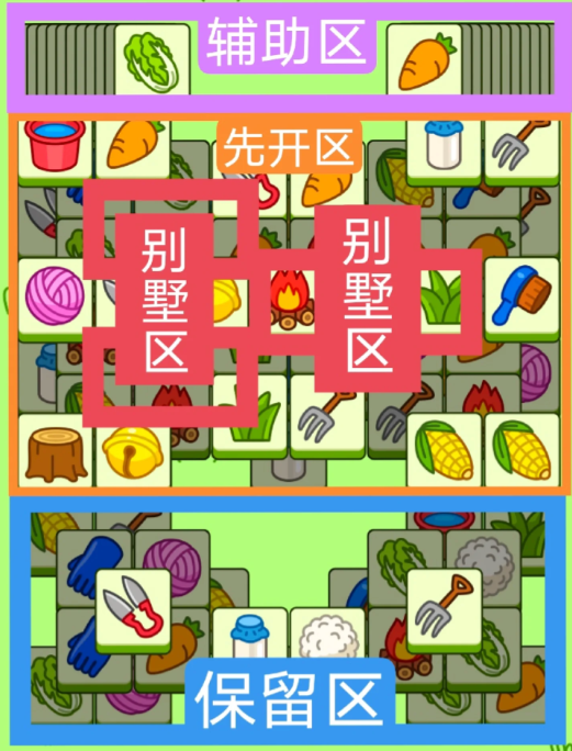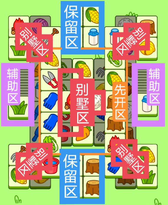 一个工字形大别墅,一个十字形大别墅,开局先消除橙色区,然后按照一层层均匀消除表面牌, 哪里压牌比较多就先消除哪里,必要时可以用盲盒区辅助消除表面牌。尽量还是以别墅区内互相消除为主。蓝色区有叠牌,但是不多,全部保留到后期使用。