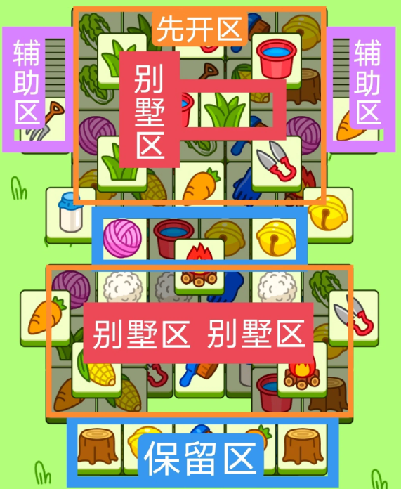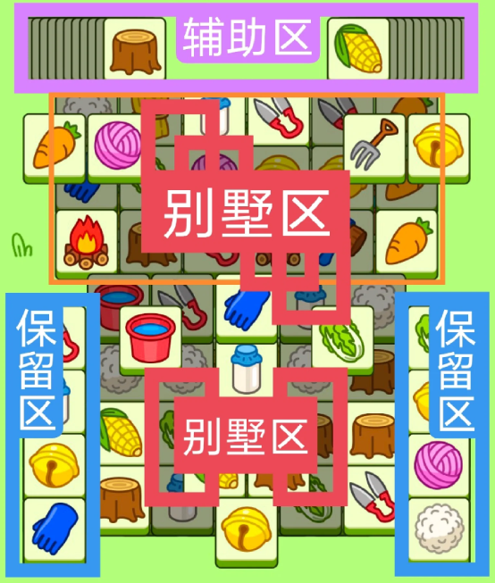 一个N字形大别墅,两个工字型大别墅,开局先消除橙色区,然后按照一层层均匀消除表面牌, 哪里压牌比较多就先消除哪里,必要时可以用盲盒区辅助消除表面牌。尽量还是以别墅区内互相消除为主。蓝色区有叠牌,但是不多,全部保留到后期使用。